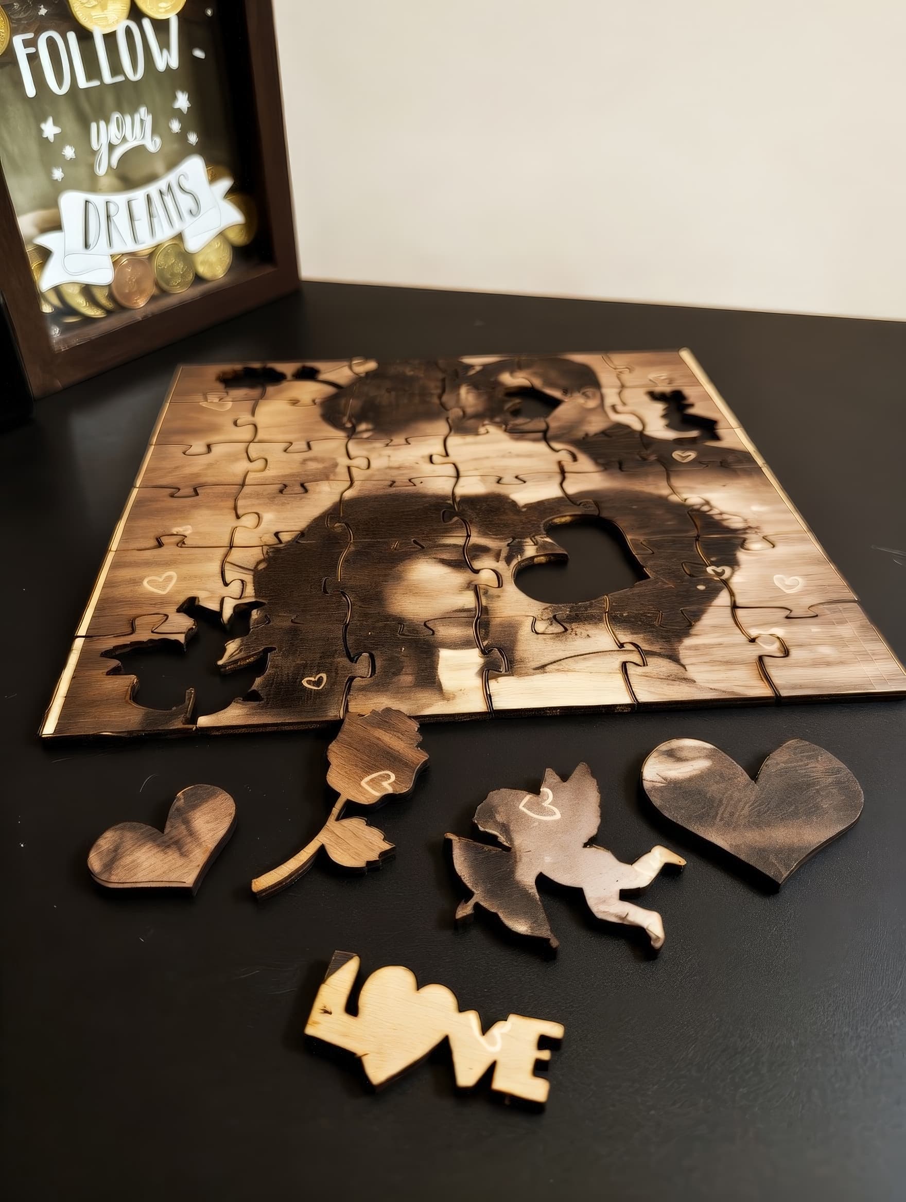 Caja de abedul báltico con tapa de nogal · Puzzle de madera personalizado (30 piezas) · Grabado láser en tapa (foto + texto + código Spotify opcional) · Sello del taller en lateral